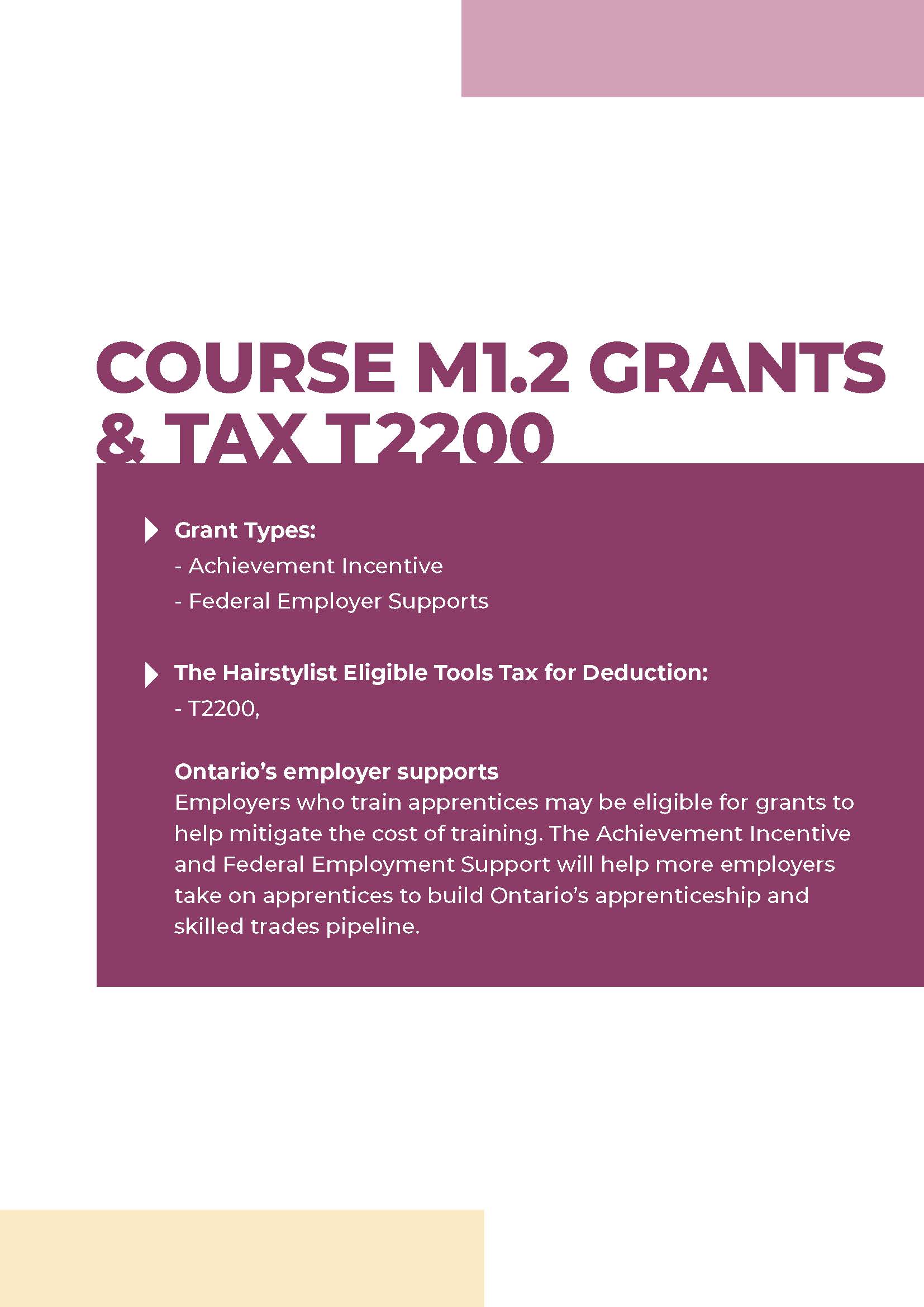 Essential Trade Related Information The Hairstylist Apprenticeship Guide Course A1.2 Grants Course A1.3 Log Book Course A1.4 Available Resources Course M1.2 Grants & Tax T2200 Course M1.3 Log Book